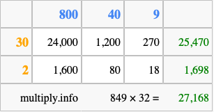 Finally, we add up all the sums we found in step 3 to get our final answer to 849 times 32.