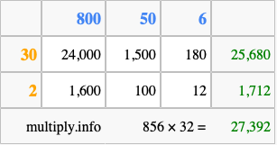 Finally, we add up all the sums we found in step 3 to get our final answer to 856 times 32.