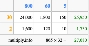 Finally, we add up all the sums we found in step 3 to get our final answer to 865 times 32.
