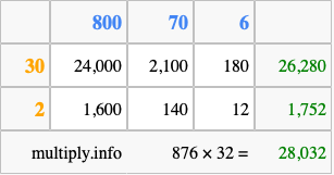 That's all there is to it! As you can see from the box above, the answer to 876 times 32 using the box method is 28,032.
