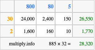 Finally, we add up all the sums we found in step 3 to get our final answer to 885 times 32.