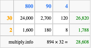 Finally, we add up all the sums we found in step 3 to get our final answer to 894 times 32.
