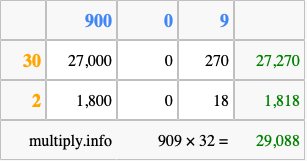 Below is an illustration showing you how to calculate 909 times 32 using the box method, using the instructions above.
