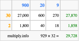 Below is an illustration showing you how to calculate 929 times 32 using the box method, using the instructions above.