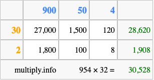 That's all there is to it! As you can see from the box above, the answer to 954 times 32 using the box method is 30,528.