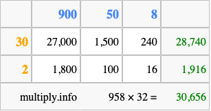 That's all there is to it! As you can see from the box above, the answer to 958 times 32 using the box method is 30,656.
