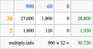 That's all there is to it! As you can see from the box above, the answer to 960 times 32 using the box method is 30,720.