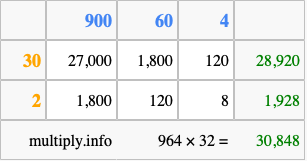 That's all there is to it! As you can see from the box above, the answer to 964 times 32 using the box method is 30,848.