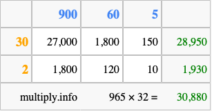 Finally, we add up all the sums we found in step 3 to get our final answer to 965 times 32.