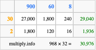 That's all there is to it! As you can see from the box above, the answer to 968 times 32 using the box method is 30,976.