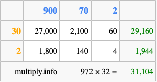 That's all there is to it! As you can see from the box above, the answer to 972 times 32 using the box method is 31,104.
