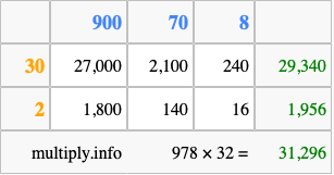 That's all there is to it! As you can see from the box above, the answer to 978 times 32 using the box method is 31,296.