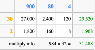 Finally, we add up all the sums we found in step 3 to get our final answer to 984 times 32.