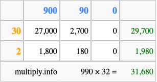 That's all there is to it! As you can see from the box above, the answer to 990 times 32 using the box method is 31,680.
