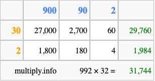Below is an illustration showing you how to calculate 992 times 32 using the box method, using the instructions above.