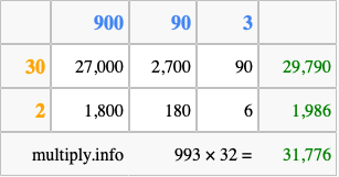 That's all there is to it! As you can see from the box above, the answer to 993 times 32 using the box method is 31,776.