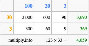 That's all there is to it! As you can see from the box above, the answer to 123 times 33 using the box method is 4,059.