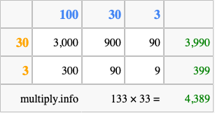 That's all there is to it! As you can see from the box above, the answer to 133 times 33 using the box method is 4,389.