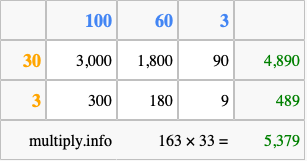 That's all there is to it! As you can see from the box above, the answer to 163 times 33 using the box method is 5,379.
