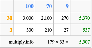 Below is an illustration showing you how to calculate 179 times 33 using the box method, using the instructions above.
