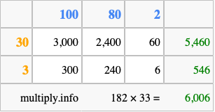 That's all there is to it! As you can see from the box above, the answer to 182 times 33 using the box method is 6,006.