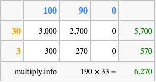 That's all there is to it! As you can see from the box above, the answer to 190 times 33 using the box method is 6,270.