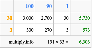 Below is an illustration showing you how to calculate 191 times 33 using the box method, using the instructions above.
