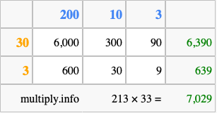 That's all there is to it! As you can see from the box above, the answer to 213 times 33 using the box method is 7,029.