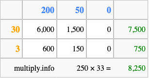 Below is an illustration showing you how to calculate 250 times 33 using the box method, using the instructions above.
