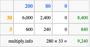 Below is an illustration showing you how to calculate 280 times 33 using the box method, using the instructions above.