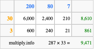 That's all there is to it! As you can see from the box above, the answer to 287 times 33 using the box method is 9,471.
