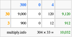 Finally, we add up all the sums we found in step 3 to get our final answer to 304 times 33.