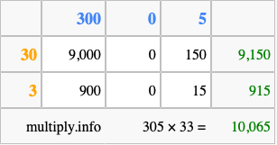 Finally, we add up all the sums we found in step 3 to get our final answer to 305 times 33.