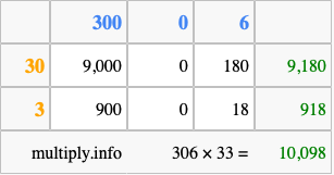 Below is an illustration showing you how to calculate 306 times 33 using the box method, using the instructions above.