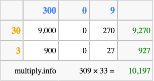 Below is an illustration showing you how to calculate 309 times 33 using the box method, using the instructions above.