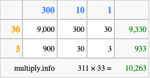 Finally, we add up all the sums we found in step 3 to get our final answer to 311 times 33.
