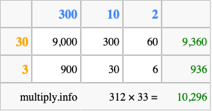 Below is an illustration showing you how to calculate 312 times 33 using the box method, using the instructions above.