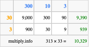 Below is an illustration showing you how to calculate 313 times 33 using the box method, using the instructions above.