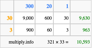 Finally, we add up all the sums we found in step 3 to get our final answer to 321 times 33.