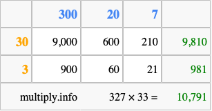 Below is an illustration showing you how to calculate 327 times 33 using the box method, using the instructions above.