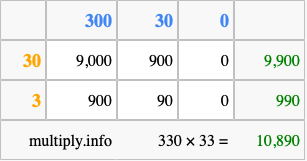 Below is an illustration showing you how to calculate 330 times 33 using the box method, using the instructions above.