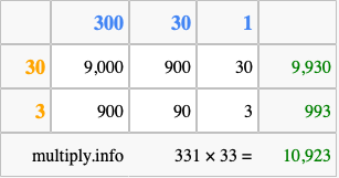 Below is an illustration showing you how to calculate 331 times 33 using the box method, using the instructions above.