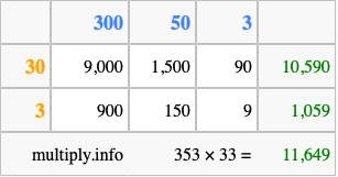 Below is an illustration showing you how to calculate 353 times 33 using the box method, using the instructions above.