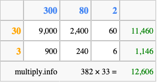 Finally, we add up all the sums we found in step 3 to get our final answer to 382 times 33.