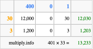 That's all there is to it! As you can see from the box above, the answer to 401 times 33 using the box method is 13,233.