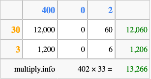 Below is an illustration showing you how to calculate 402 times 33 using the box method, using the instructions above.