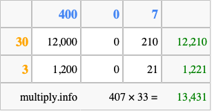 That's all there is to it! As you can see from the box above, the answer to 407 times 33 using the box method is 13,431.