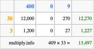 That's all there is to it! As you can see from the box above, the answer to 409 times 33 using the box method is 13,497.