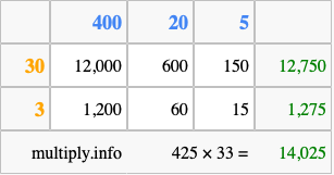 Finally, we add up all the sums we found in step 3 to get our final answer to 425 times 33.