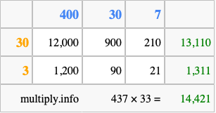 Below is an illustration showing you how to calculate 437 times 33 using the box method, using the instructions above.